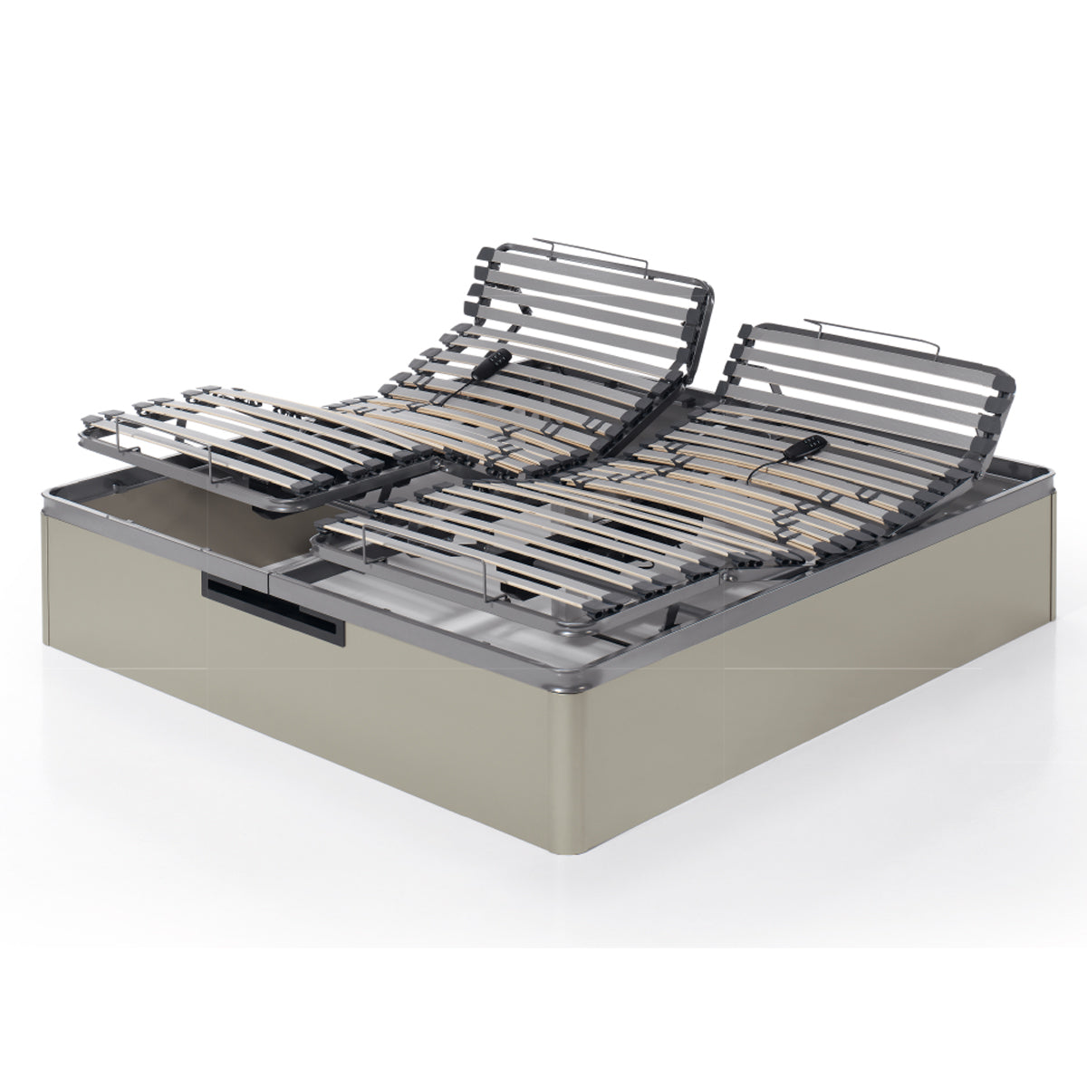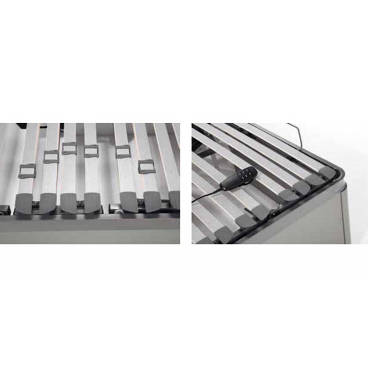 5 planos articulados por motor con mando con cable, siendo fijo el plano lumbar, incorpora doble lama y cursores para la regulación de firmeza.