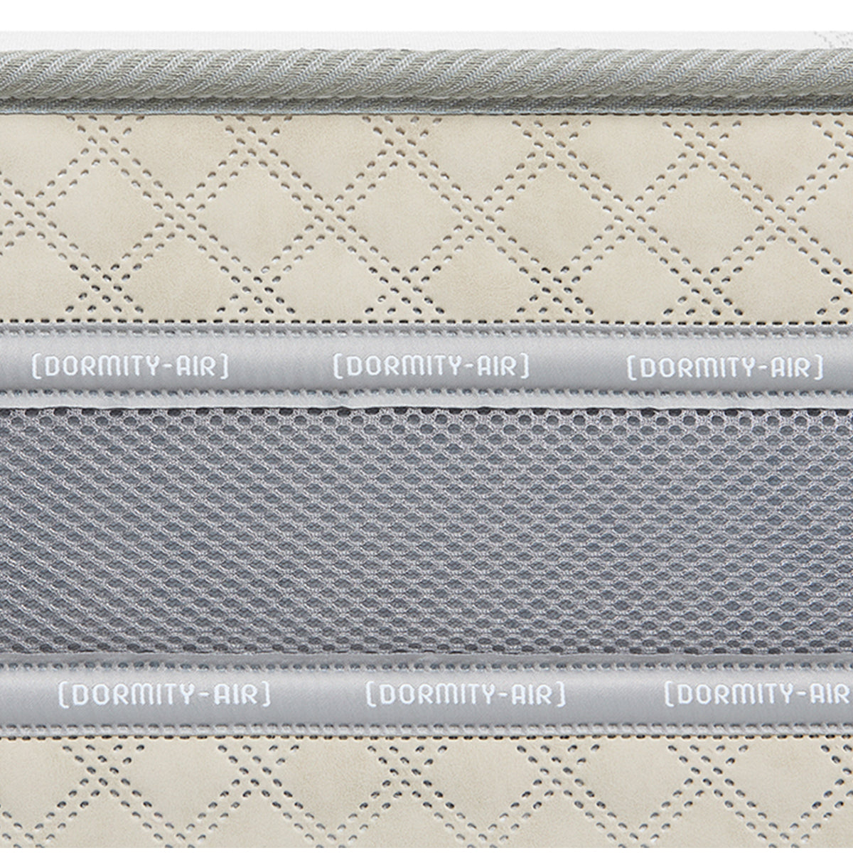 El acolchado inferior incluye tres capas distintas a base de tejido TNT, fibra y tejido en 3D de color plateado. La funda en tejido Stretch, muy habitual en los colchones Dormity, es transpirable, por lo que evitarás la acumulación de malos olores y bacterias en tu colchón.